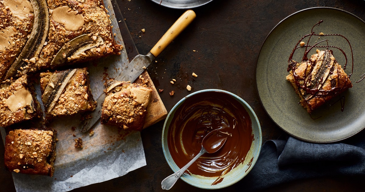 - Roughly chop roasted almonds and chocolate. Add ¾ cup almonds and ¾ of chocolate chunks to batter. Switch batter to baking dish and easy high with a spatula. Dollop remaining peanut butter over high, in addition to remaining almonds. Peel agency bananas, lower in half lengthways, gently press slices into high of cake seed aspect up, and sprinkle with brown sugar. Place in oven and bake 35 minutes, till golden brown on high.