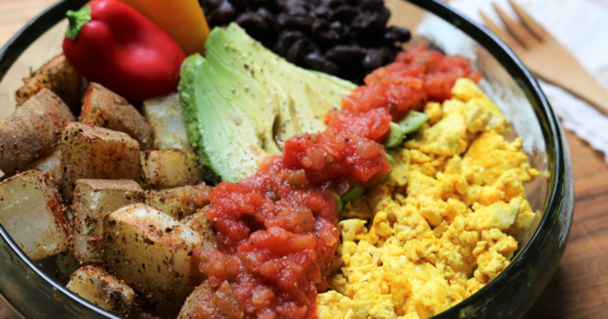- To serve, divide potato and bean combination between two plates and layer every with tofu āhuevos,ā salsa, and avocado.